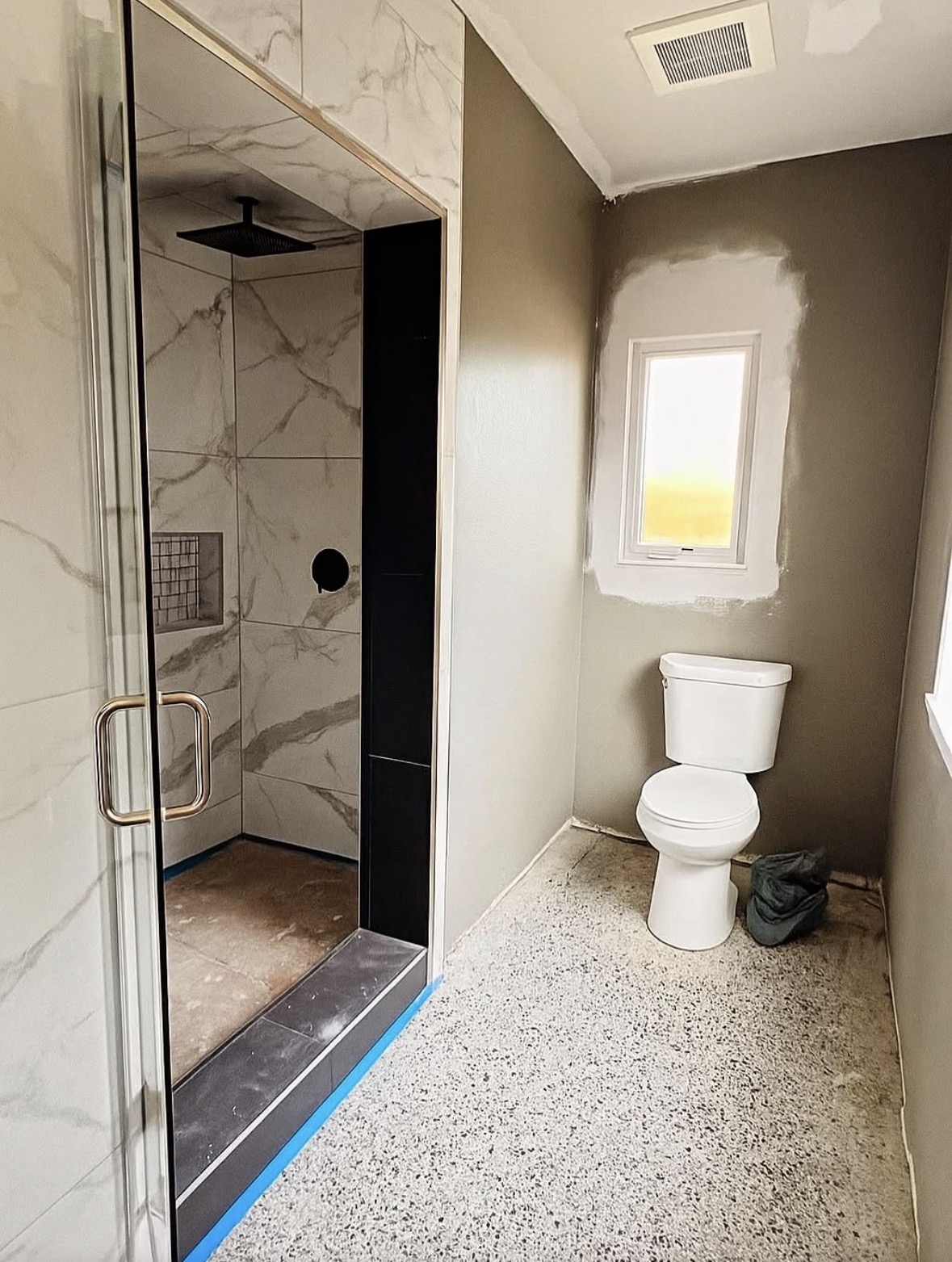 A recently completed modern bathroom featuring a freestanding bathtub as the room's focal point. The design includes a glass-enclosed walk-in shower with a black exposed pipe system and a built-in niche.